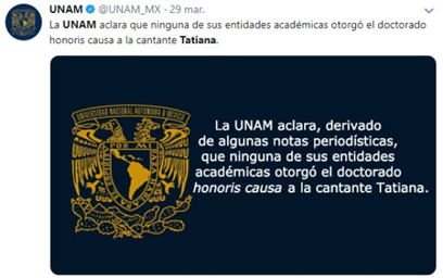 Recomendamos leer: https://elruinaversal.com/2019/04/02/tatiana-presume-obtener-doctorado-honoris-causa-por-la-unam-universidad-lanza-comunicado-para-desmentirla/